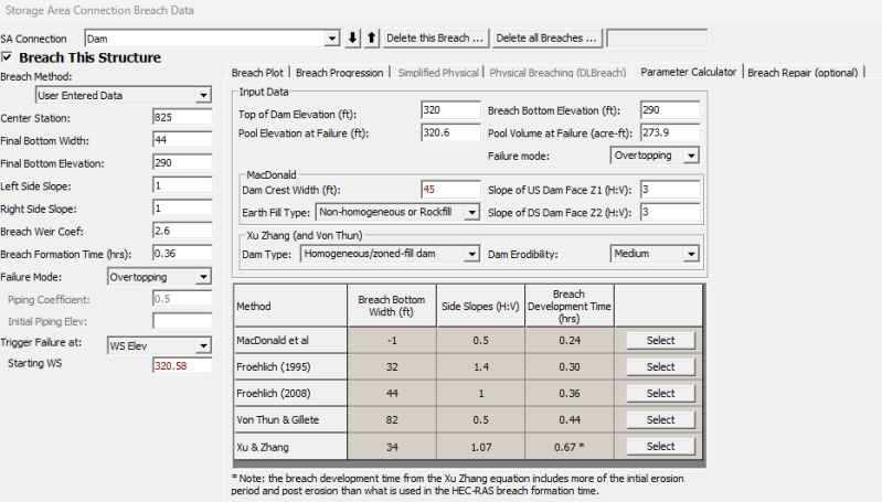From HEC-HMS, opening the Summary Table of the Reservoir, you can obtain two useful values for the Breach Analysis: